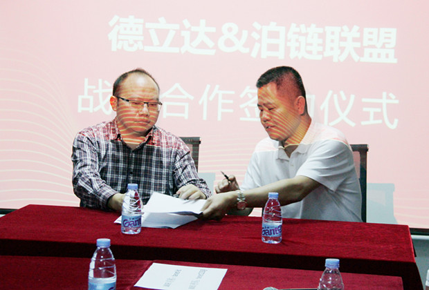 德立達董事長黃思林與泊鏈聯盟楊義平在合作戰略書上相互簽字。