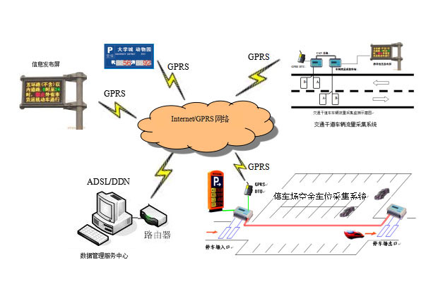 基于TPG300系列車輛流量采集終端的城市停車誘導系統主要由五部分構成:停車場區位引導系統(停車場空余車位采集系統);城市交通干道車輛流量采集系統;分布在各市政干道和社區的LED信息發布屏;移動GPRS數據傳輸網絡;基于Internet服務器的數據管理服務中心。
