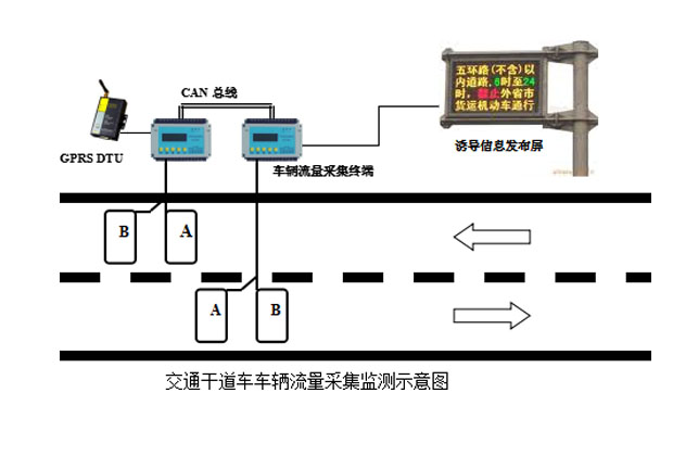 每個車道埋設兩個線圈使用一個流量采集終端,多個車道可將多個車輛流量采集終端通過CAN總線聯網使用,并通過連接在1號采集終端上的GPRS DTU模塊將采集數據按要求實時傳入Internet網絡,同時采集終端將采集到的車位信息通過RS485總線發送到本地LED發布屏上。
