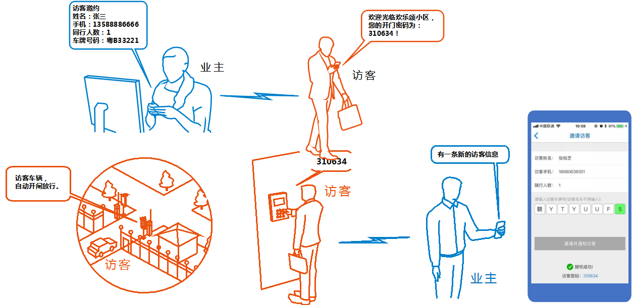1、業(yè)主APP訪客車牌、門禁授權(quán),短信發(fā)送門禁密碼;